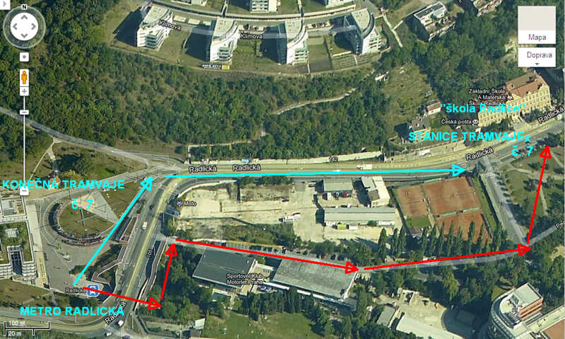 B/ Tramvají 7 od Anděla do stanice Škola Radlice, přejdete přes silnici na druhou stranu k parku a dojdete dolů k dveřím č. 99. Pokud přijedete od metra Radlická, přejdete pouze na chodník.